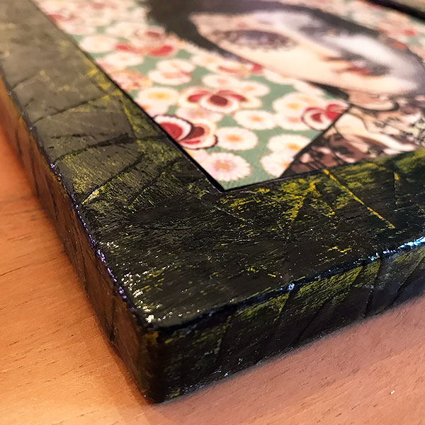 This artwork was created in Photoshop. It was printed on sintra. And it is housed in a one-of-a-kind collage frame built by Alain Francoeur. The frame was created with wood, paper, acrylic paint and a special glue/varnish to protect and hold everything together.